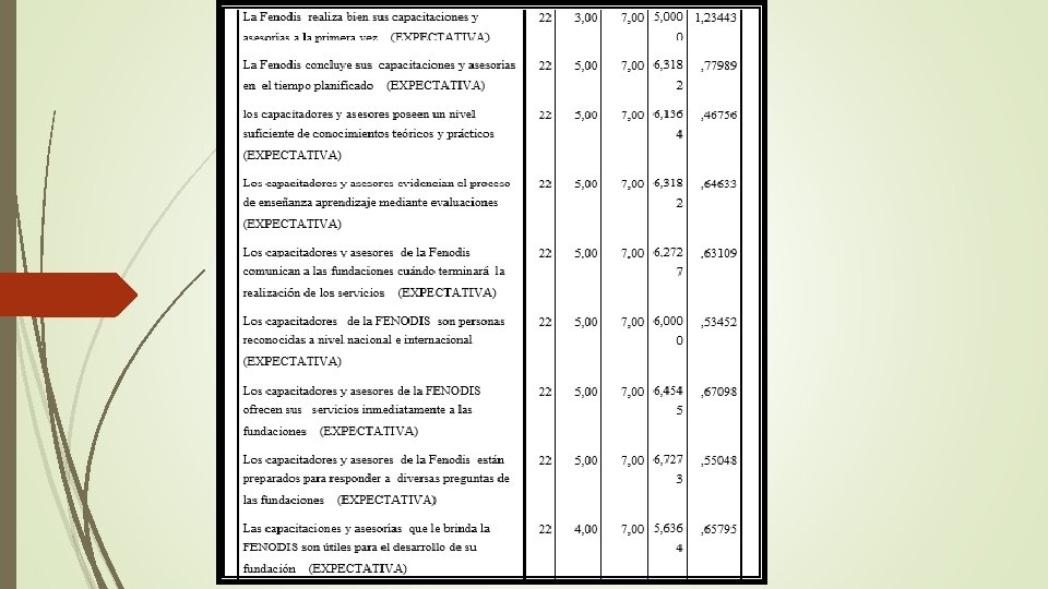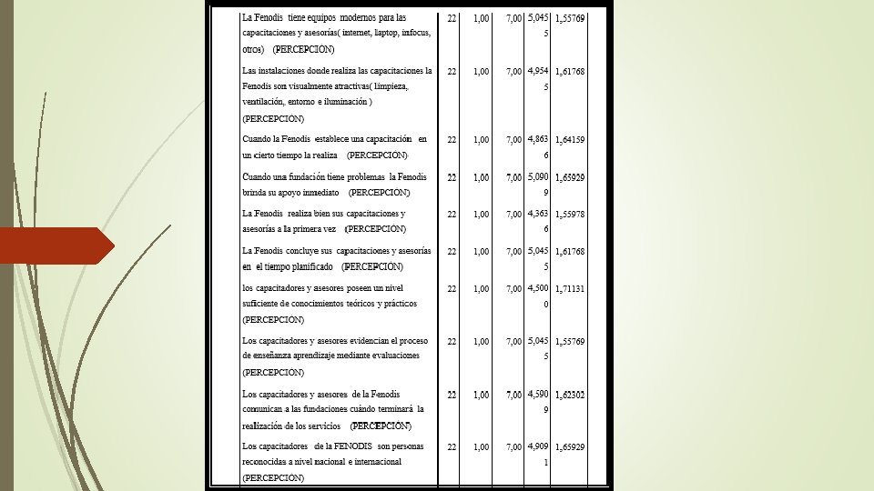 RESULTADO DEL MODELO KANO ATRIBUTOS LINEALES 1. Capacitadores calificados y de experiencia 2. Claridad y entendimiento de las capacitaciones ATRIBUTOS OBLIGATORIOS Mantener temas de desarrollo Institucional, elaboración y diseños de proyectos, elaboración de planes estratégicos. 3. Limpieza y comodidad de las aulas 4. Equipamiento de la Fenodis 5. Motivación a las fundaciones 6. Amabilidad y buen trato 7. Temas Terapéuticos ATRIBUTOS DE ATRACCIÓN 1. Información externa sobre concursos o eventos que realice la FENODIS 2. Necesidad de la fundación antes de planificar una capacitación 3. Página web principal de FENODIS