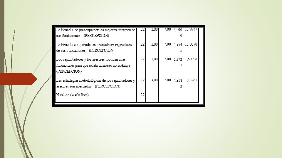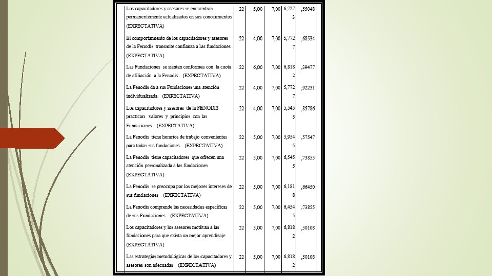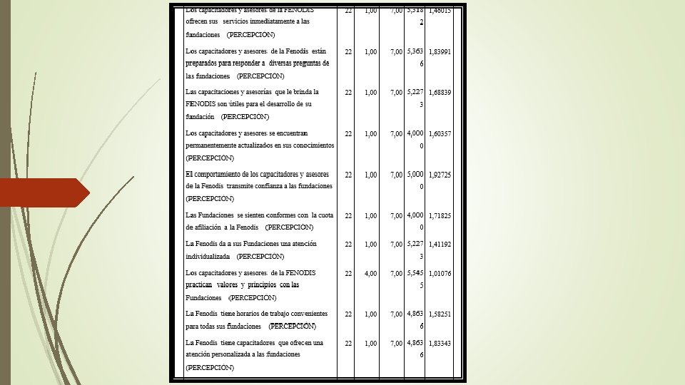 ANÁLISIS DE COEFICIENTES DE NIVELES DE SATISFACCIÓN E INSATISFACCIÓN POR ATRIBUTO SATISFACCIÓN E INSATISFACCIÓN -40. 91 -57. 14 Página web 72. 73 Necesidad -86. 36 76. 19 Temas Terapéuticos -68. 42 Temas de desarrollo institucional -59. 09 -100. 00 81. 82 42. 11 Información externa 72. 73 Amabilidad y buen trato -81. 82 -85. 71 -100. 00 81. 82 Motivación a las fundaciones 54. 55 Equipamiento de la Fenodis 71. 43 Limpieza y comodidad de las aulas 68. 18 -90. 91 Claridad y entendimiento de las capacitaciones -95. 45 -150. 00 -100. 00 72. 73 Capacitadores calificados y de experiencia -50. 00 77. 27 50. 00 100. 00 INSATISFACCIÓN SATISFACCION