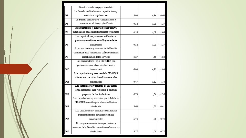 Gráfico comparativo nivel de insatisfacción de las fundaciones 0. 00 P 1 P 2 P 3 P 4 P 5 P 6 P 7 P 8 P 9 P 10 P 11 P 12 P 13 P 14 P 15 P 16 P 17 P 18 P 19 P 20 P 21 P 22 P 23 P 24 Series 1 -1. 64 -0. 36 -1. 23 -1. 55 -0. 64 -1. 27 -1. 68 -1. 09 -1. 14 -1. 36 -0. 41 -2. 73 -0. 77 -2. 82 -0. 55 0. 00 -1. 09 -1. 68 -1. 18 -1. 50 -1. 55 -2. 00 -0. 55 -0. 50 -0. 64 -0. 77 0. 00 -1. 50 -1. 09 -1. 14 -1. 23 -1. 64 -1. 27 -1. 55 -1. 27 -1. 64 -1. 09 -1. 18 -1. 36 -1. 50 -1. 55 -1. 68 -2. 00 -2. 50 -2. 73 -2. 82 -3. 00 Análisis: Como se puede observar en el gráfico las preguntas que generan mayor nivel de insatisfacción son la 14 y 16 debido a que son las brechas más altas.