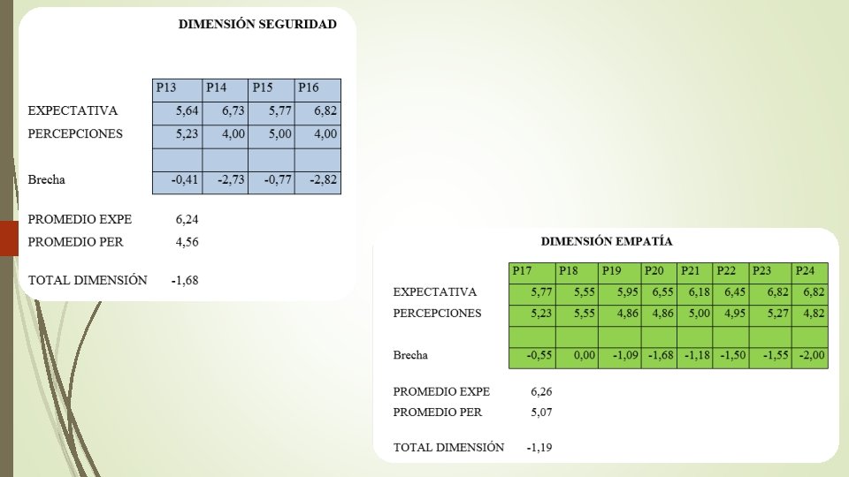 TABLA RESUMEN DE DIMENSIONES RESULTADOS MODELO SERVQUAL DIMENSIÓN PROMEDIO EXPE PROMEDIO PER BRECHA TANGIBLE 6, 00 5, 00 -1, 00 FIABILIDAD 6, 08 4, 82 -1, 27 CAPACIDAD DE RESPUESTA 6, 36 5, 05 -1, 32 SEGURIDAD 6, 24 4, 56 -1, 68 EMPATÍA 6, 26 5, 07 -1, 19
