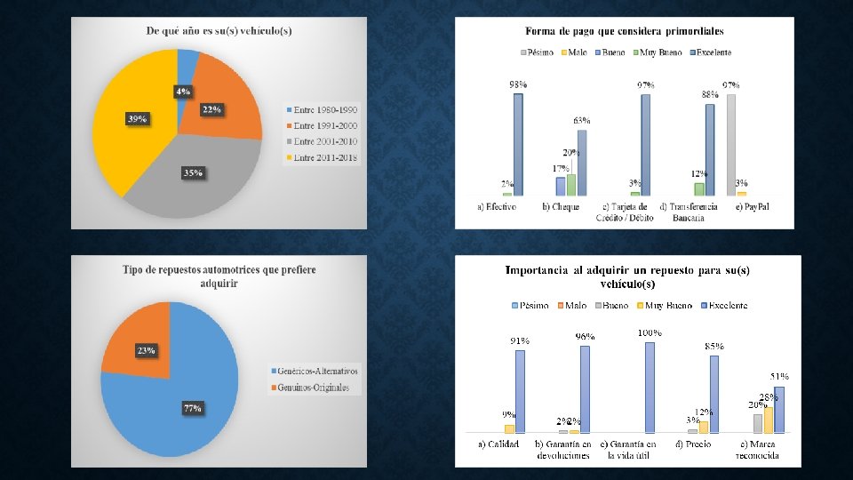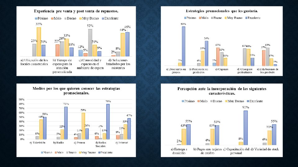 CONCLUSIONES De acuerdo al estudio realizado en el sector de venta de repuestos automotrices en el Cantón Rumiñahui se llegó a determinar que existe un alto número de personas que tienen vehículo en su mayoría entre los años 2010 -2018, y de las cuales la gran parte son hombres pero cerca del 30% son mujeres siendo ésta una cifra considerable en la compra de repuestos automotrices. Los encuestados tienen una frecuencia en el mantenimiento de sus vehículos cada 5. 000 km en su mayoría y con ello la compra de repuestos automotrices en líneas de lubricantes, frenos, motor y suspensión comúnmente; siendo Chevrolet, Hyundai, Kía, Toyota y Mazda las marcas más comerciales del cantón Rumiñahui y los repuestos genéricos-alternativos los más adquiridos. Las parroquias de Sangolquí y San Rafael son los sectores más comerciales de repuestos automotrices del Cantón Rumiñahui, pese a eso el 42% de personas no adquiere personalmente los repuestos automotrices para sus vehículos por diferentes motivos como desconocimiento, falta de tiempo y por comodidad. Se utilizó el método Kano con el objetivo de calificar la importancia que tienen las formas de pago, las estrategias promocionales, los medios de comunicación indicados para la difusión de las estrategias promocionales y las características de los productos en el sector de repuestos automotriz. Existen varios factores en la experiencia pre venta y post venta de los consumidores de repuestos automotrices, de los cuales la comodidad y espacio en el ambiente de espera no es el adecuado, así como también el tiempo de espera para la atención personalizada es extenso en los negocios de venta de repuestos automotrices. Los consumidores de repuestos automotrices consideran importante la incorporación de servicios adicionales como la capacitación del personal, variedad de stock, entrega a domicilio y pagos con tarjetas de crédito en los negocios de repuestos automotrices.