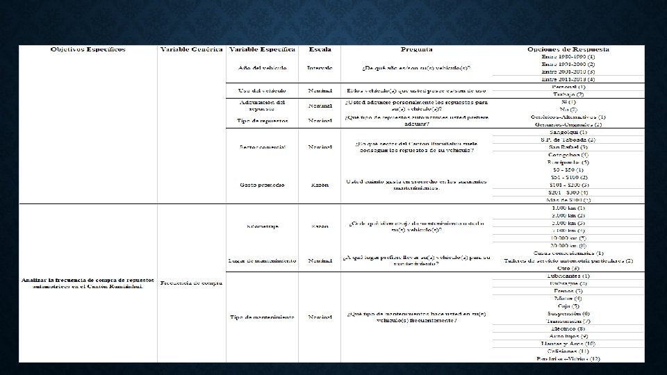 OBJETIVO GENERAL “Analizar los factores que influyen en la satisfacción de la aplicación de las estrategias del Marketing Mix en el sector de venta de repuestos automotrices del Cantón Rumiñahui aplicando el modelo KANO”. OBJETIVOS ESPECÍFICOS • Analizar las variables y los motivos que satisfacen la aplicación de las estrategias de Marketing Mix en el sector de venta de repuestos automotrices. • Analizar la frecuencia de compra de repuestos automotrices en el Cantón Rumiñahui. • Desarrollar el estudio de investigación de la aplicación de las estrategias del marketing mix, mediante el modelo Kano • Proponer opciones de mejora en la venta de los repuestos automotrices de manera estandarizada.