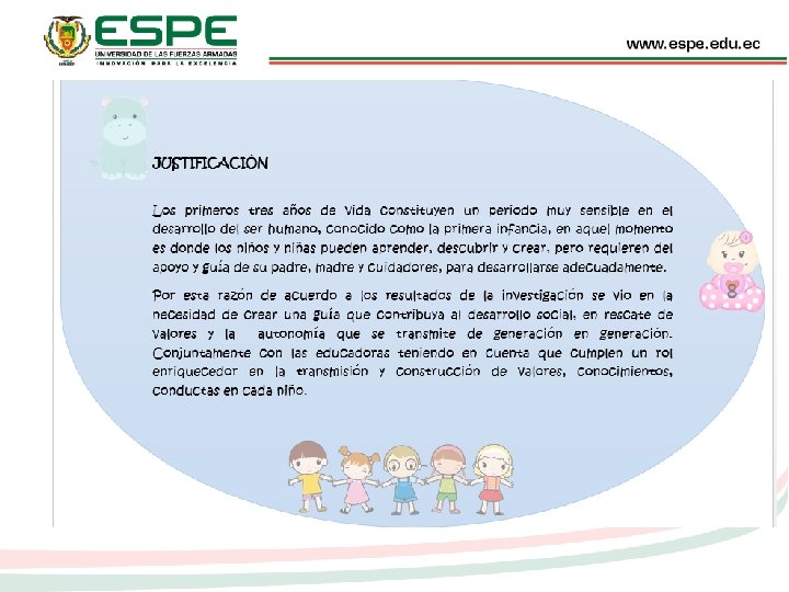 JUSTIFICACIÓN Permitirá identificar la influencia de las costumbres ancestrales en los hábitos de higiene personal de los niños de 1 a 3 años Corresponsabilidad de padres y educadoras Impacta a nivel social en el desarrollo del niño, la familia y la comunidad.