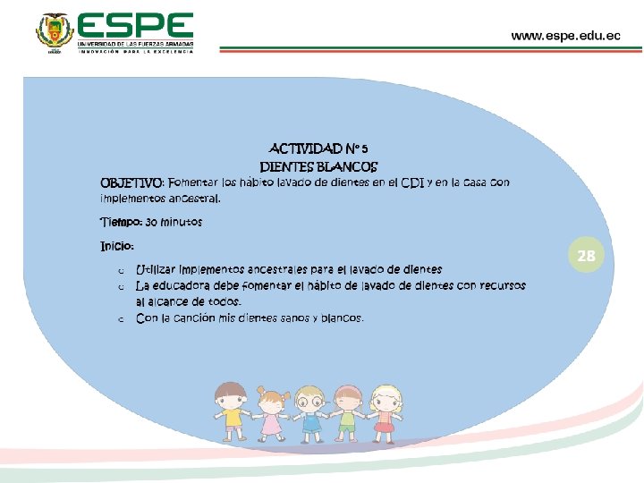RECOMENDACIONES Realizar secuencia de la práctica de hábitos de higiene de la casa como en el CDI, con el fin de rescatar las costumbres ancestrales, de esta manera buscar una alternativa de desarrollo pleno y que en la rutina del CDI se considere el rescate de las costumbres en su diario vivir, permitiendo desarrollar la parte social de una mejor manera y evitar la pérdida de identidad cultural. Tener más compromiso por parte de los docentes y padres de familia en el fortalecimiento de hábitos de higiene puesto que son escasos a los hábitos que deberían tener a esta edad. Siendo que es de vital importancia para el desarrollo físico, emocional, intelectual y social de los niños y niñas. Motivar a las educadoras a aplicar técnicas de conocimientos ancestrales ligado a los hábitos de higiene personal en todo momento adecuado. Desarrollar una guía de actividades de fortalecimiento de hábitos de higiene, dirigida a docentes a fin que tengan actividades prácticas conocimiento acertado sobre las costumbres ancestrales.
