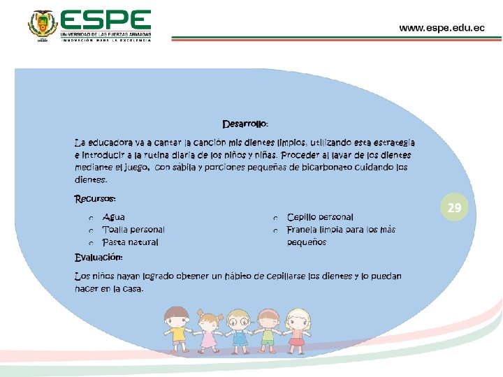 PROPUESTA Motivar a las educadoras de los Centros de Desarrollo Infantil (MIES) del Distrito Mejía – Rumiñahui, la utilización de una guía técnica y básica de apoyo pedagógico que permita rescatar las costumbres ancestrales para fortalecer los hábitos de higiene personal de niños de 1 a 3 años.