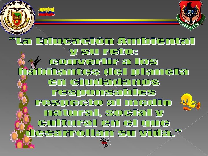 CONCLUSIONES El 50 % de los directivos y el 57% de los docentes no tienen conocimiento del Plan Nacional de Educación Ambiental para la Educación Básica y el Bachillerato. El 86% de docentes realizan actividades a favor del medio ambiente como: visitas a parques, campañas de cuidar el medio ambiente, instalar basureros, realizar charlas con los niños y padres de familia sobre el reciclaje, cuidado y conservación del medio ambiente, la realización de talleres agro-ecológicos, visitar el parque Jerusalén, el museo del agua y el Zoológico de Guayllabamba El 100% de los docentes, abordan la Educación Ambiental dentro de la asignatura de Ciencias Naturales, demostrando así que no se le da la debida importancia a la temática ambiental.
