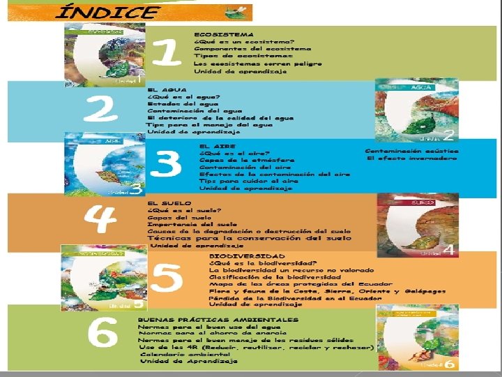 ESTRUCTURA DEL MANUAL TALLER 1 EL ECOSISTEMA TALLER 2 EL AGUA TALLER 3 EL AIRE TALLER 4 EL SUELO TALLER 5 LA BIODIVERSIDAD TALLER 6 BUENAS PRÁCTICAS AMBIENTALES