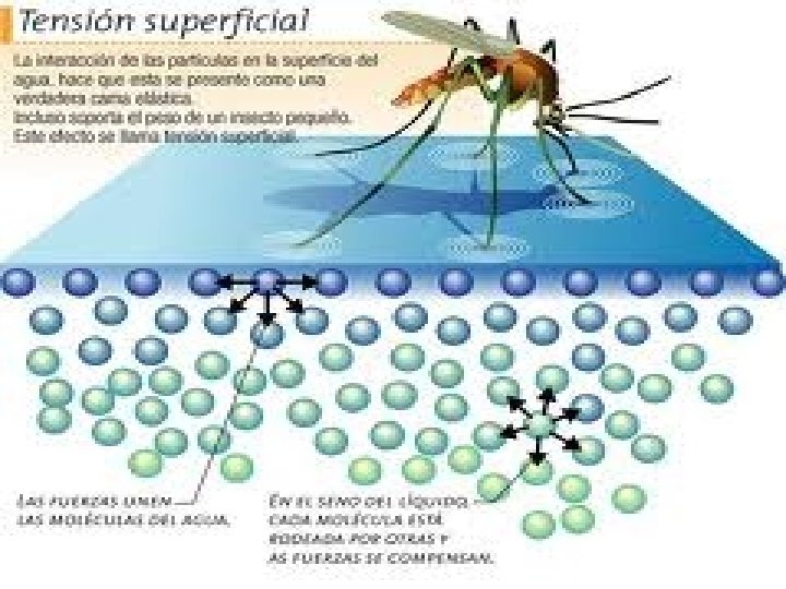 TENSIÓN SUPERFICIAL Las fuerzas de cohesión entre las moléculas de la superficie de un líquido son las responsables de la tensión superficial. Las moléculas de agua que se ubican en la superficie del líquido tienen contacto con las moléculas de agua que están debajo de ellas, no con las del interior del líquido. Por este motivo, las moléculas que se encuentran en la superficie se cohesionan con más fuerza a aquellas que están inmediatamente bajo ellas y así forman un flim o membrana elástica en la superficie del líquido.