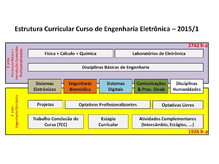 Currículo – Engenharia Elétrica • Conteúdos Básicos: Disciplinas básicas. (33%) • Conteúdos Profissionalizantes: (34%) • Conteúdos Profissionalizantes Específicos: disciplinas optativas em pelo menos quatro das seis áreas de especialização. (12%) • Conteúdos Livres: Qualquer curso da UFSC ou de outra Universidade, bem como uma atividade complementar de monitoria, pesquisa ou extensão. Total: 144 horas/aula (3%) • Projetos: Pelo menos duas disciplinas de projetos nível 1 e uma disciplina de projeto nível 2. (4%) • Estágio Curricular: 360 horas de estágio. (7%) • Trabalho de Conclusão de Curso: Projeto no final do curso de 360 horas/aula. (7%)