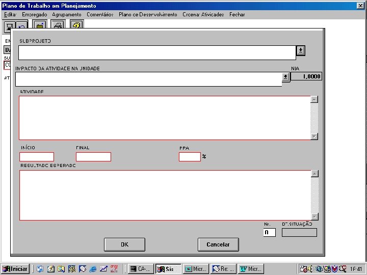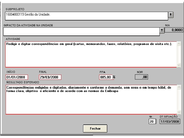 Fase 1 - Planejamento Preenchimento do Plano de Trabalho - Atividade - o que deverá ser realizado pelo empregado ao longo do ano. - Resultado esperado - representa o produto final do trabalho desenvolvido. - PPA - Peso por Atividade - representa a importância de cada atividade. É expresso em % e é definido em função da complexidade da tarefa, sua prioridade em relação às demais e tempo a ser gasto para realizá-la. Deve totalizar 100%. - NIA – Nível de Impacto da Atividade - relaciona as atividades do empregado com os objetivos e metas da Unidade.