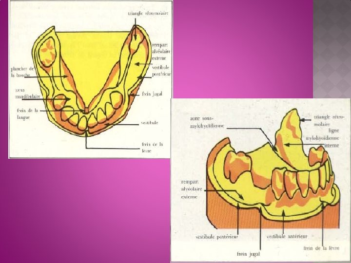 9)Les zones de réflexion muqueuses: ce sont des replis muqueuses compris entre le rebord alvéolaire externe et les joues , la langue , ou les lèvres. Une empreinte précise enregistrant la profondeur et l’épaisseur de ces zones est indispensable , car dans la plus part des cas les selles prothétiques doivent les combler parfaitement. l’enregistrement de la zone de réflexion muqueuse au niveau du plancher est particulièrement important pour le tracé et la réalisation de la barre linguale.