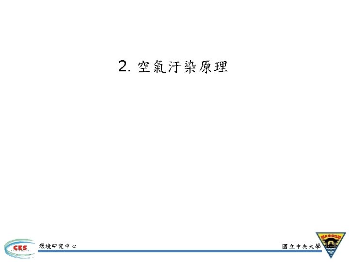 2. 空氣汙染原理 Oxidation and transformation 1. • Several species in the troposphere are capable of absorbing solar radiation and hence initiating radicalchain oxidation. • Ozone is the photochemical precursor of the hydroxyal radicals: (R 1) O 3 + hν (R 2) O�('D) + H 2 O (R 3) O�('D) + M O�('D) + O 2 (λ ≤ 310 nm) O�H + OH O�+ M H 2 O is minor compared with M M= N 2 , O 2 環境研究中心 國立中央大學