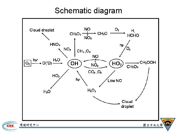 2 If nitrgen oxides are present in the troposphere (e. q polluted troposphere) (R 12) HO 2 + NO OH + NO 2 (R 13) CH 3 O 2 + NO CH 3 O + NO 2 + hν (R 14) CH 3 O + O 2 HCHO + HO 2 O + O 2 + M O + NO O 3 + M • (R 12) regenerate OH • (R 13), (R 14) yields formaldehyde (HCHO) • Formaldehyde then photolysed at λ< 338 nm to produce H and HCO (R 15) HCHO + hν + HCO (λ< 338 nm ) and both radicals re-enter the. HHO chain, via x (R 8) H + O 2 +M (R 16) HCO + O 2 環境研究中心 HO 2 + M CO + HO 2 for HCO 國立中央大學