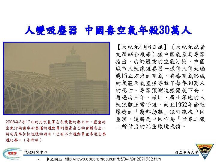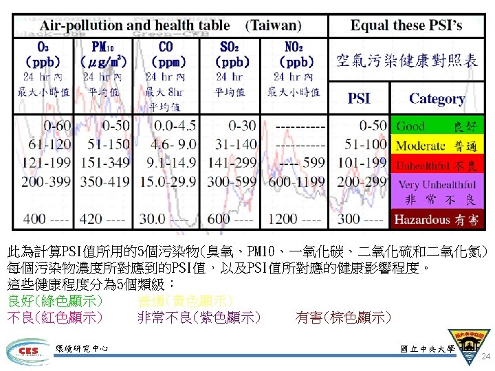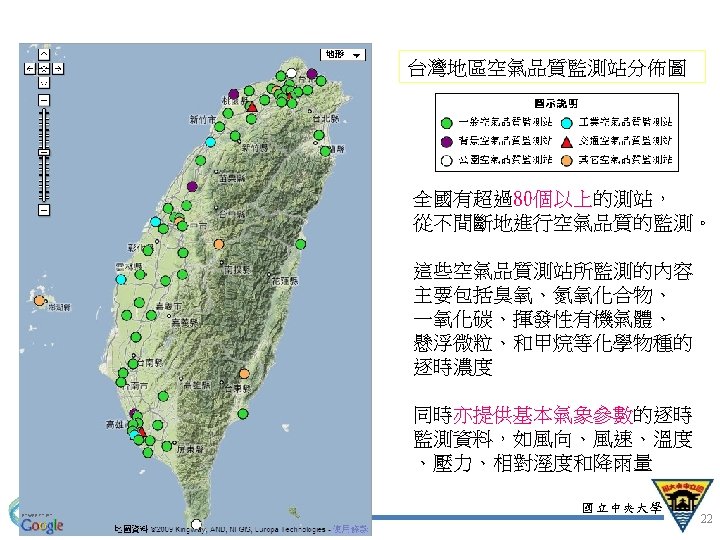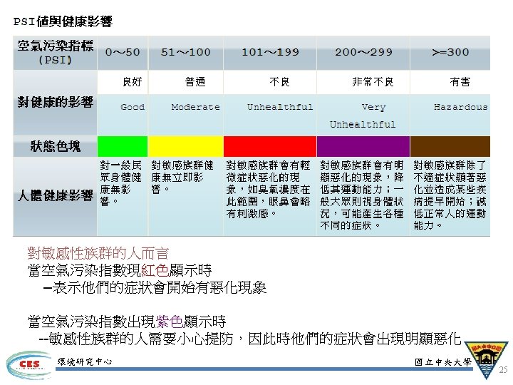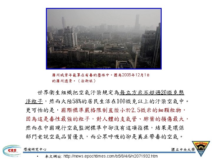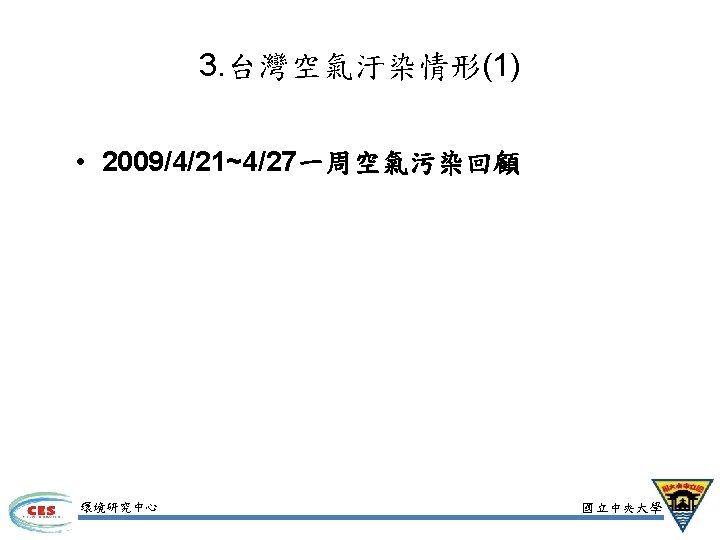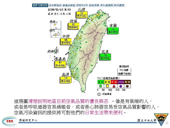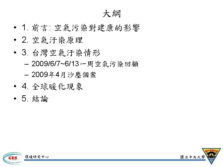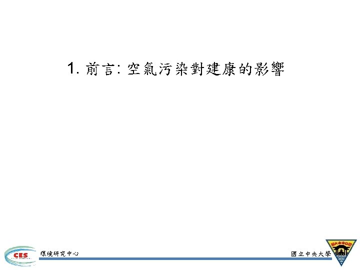 5. Conclusion • Taiwan’s EPA contains very good real-time data for ambient air pollution measurements. • There are many interesting and important things can be done based on this data. • Since air pollution exerts big impact on human health, future researches focusing on the relationship between health and air pollution will be a hot topic for the years to come. 環境研究中心 國立中央大學