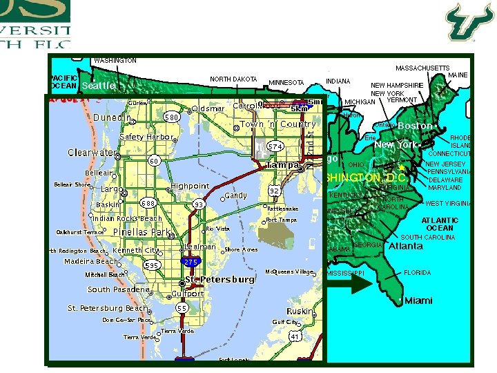 USF At a Glance Ø Ø Ø Ø Ø Founded in 1956 The 9 th largest university in US (>45, 000 students) Tampa is at heart of one of the fastest growing areas of US (catchment population = 3, 900, 000) More than 1, 660 faculty 1 of only 3 state universities in Florida with Carnegie Research I status $320, 000/year in research funding (#2 in Florida) Member of the Florida High Tech Corridor Medical school, #1 Cancer Institute in Florida (Moffitt Cancer Center), #1 Alzheimer’s Institute in Florida Big East Conference