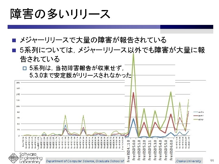 障害報告ID取得および該当コンポーネント特定 コミットログ k k 版管理 システム リポジトリ 出力 --------1999 -02 -04 | ~~~ ~~~ --------1999 -01 -24 | ~~~ ~~~ 抽出 --------r 1234|name|~~ M ~/sys/amd 64/~ M ~/sys/cddl/~ ~~ PR: i 386/321 kern/342 ~~ 修正された コンポーネント バージョン毎に 分類 照合 k 障害報告 管理システム 取得 ---------~~~ Number: 342 Category: kern ~~~ Severity: serious 重要度で フィルタリング 対応付け 対応表 --------- Free. BSD 7. 0. 0 amd 64: 321, 342, 350, ~~~ cddl: 321, 342, 347, ~~~ kern: 335, ~~~ Department of Computer Science, Graduate School of Information Science & Technology, Osaka University 4