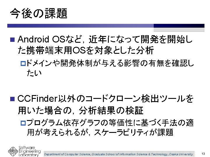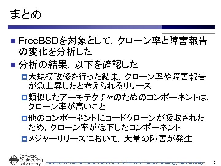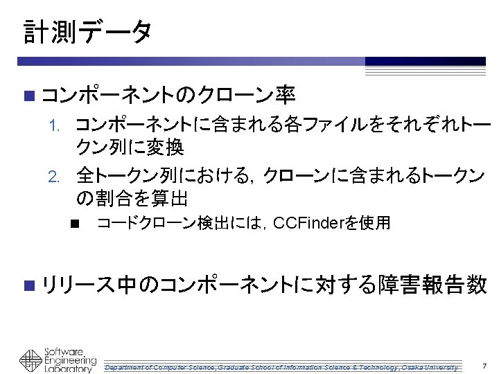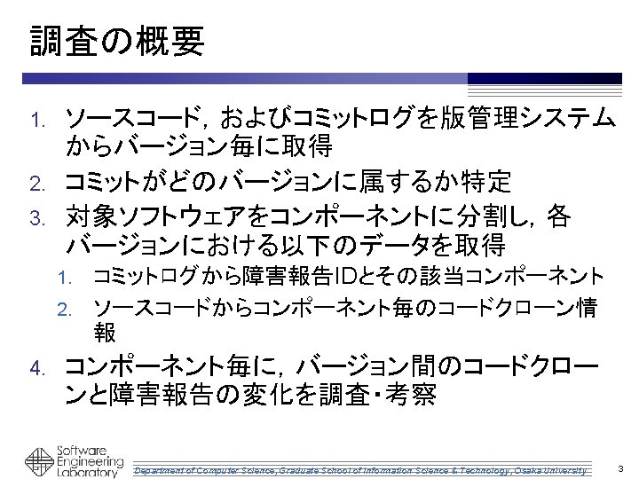 オープンソースソフトウェアの 進化におけるコードクローンと 障害報告の関係の調査 井上研究室 政井 智雄 Department of Computer Science, Graduate School of Information Science & Technology, Osaka University