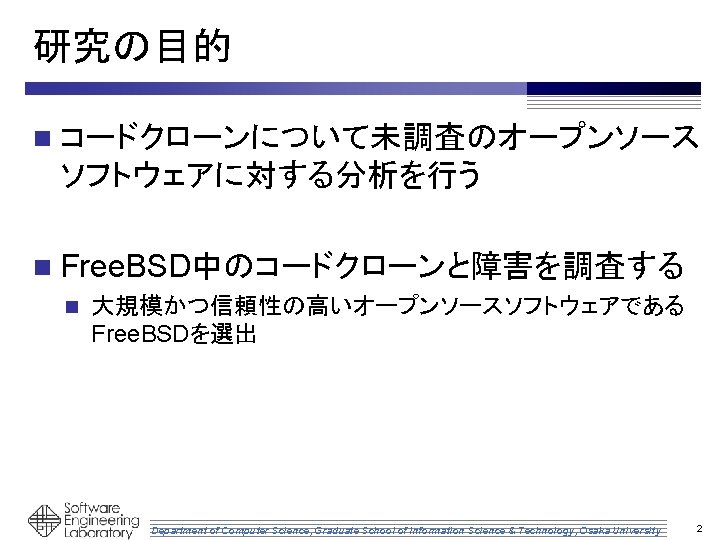研究の背景 n コードクローン p ソースコード中に存在する一致または類似したコー ド片 p オープンソースソフトウェアのソースコードに対する コードクローンの変化の調査が行われている Linux. SCSIドライバにおけるクローン化の調査[Godfrey 2011] n Linuxカーネルにおけるクローン化の調査[Antonio 2002] n [Godfrey 2011] Wei Wang and Michael,W.Godfrey,“A Study of Cloning in the Linux SCSI Drivers” Scam 2011 [Antonio 2002] G.Antoniola,U.Villanob,E.Merloc,M.Di Pentaa“Analyzing cloning evolution in the Linux kernel” Department of Computer Science, Graduate School of Information Science & Technology, Osaka University 1