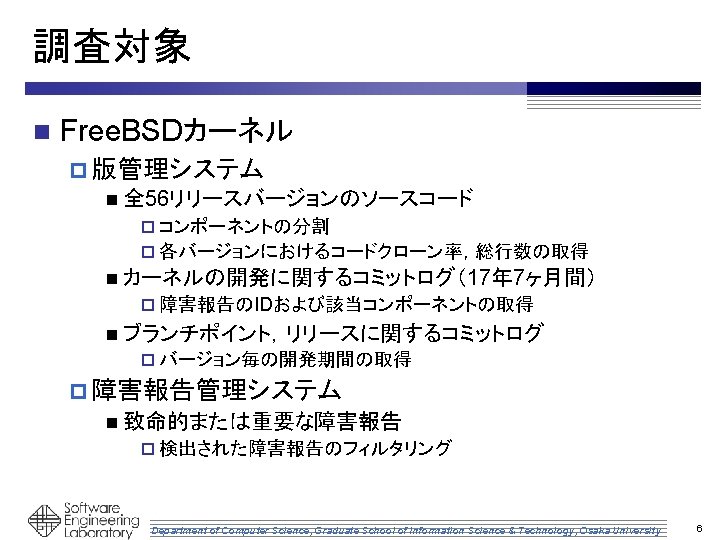 バージョン毎の開発期間の特定 CURRENT 7 -STABLE 7. 0 -RELENG 7. 0. 0 -RELEASE 7. 1 -RELENG 7. 4 -RELENG ・・・ 7. 1. 0 -RELEASE 7. 4. 0 -RELEASE CURRENT 8 -STABLE 8. 0 -RELENG 8. 0. 0 -RELEASE 8. 1 -RELENG 8. 1. 0 -RELEASE 8. 2 -RELENG 8. 2. 0 -RELEASE Department of Computer Science, Graduate School of Information Science & Technology, Osaka University 5