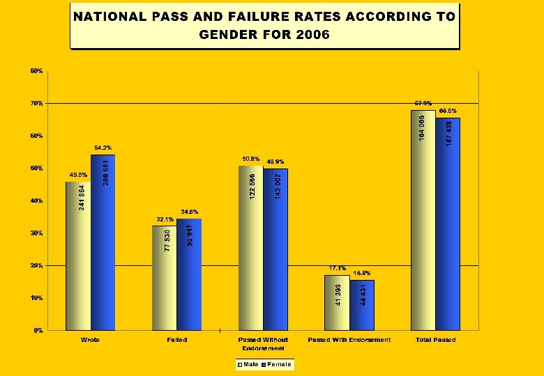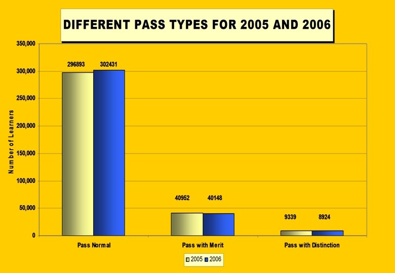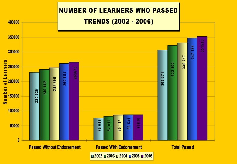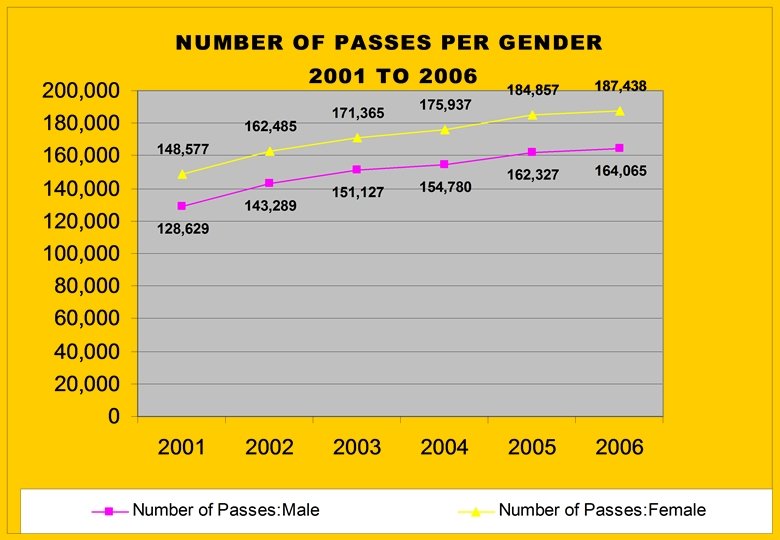 Passes per Gender 2001 – 2006 Narrowing the gap towards gender parity YEAR MALE 2001 2002 2003 2004 2005 128 629 143 289 151 127 154 780 162 % 63. 6 70. 7 75. 1 72. 0 69. 7 FEMAL E 148 577 162 485 171 365 175 937 184 % DIFF. % 60. 1 19 948 3. 5 67. 4 19 196 3. 3 71. 8 20 238 3. 3 69. 5 21 157 2. 5 67. 2 22 530 2. 5