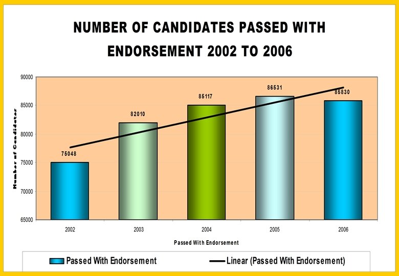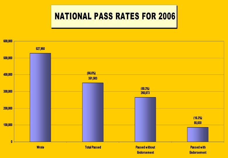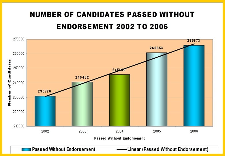 Number enrolled, writing and passing SC 2004 to 2006 examination YEARS IN COMPARISON Number enrolled Number Wrote Number passed Number with endorsement 2004 493 447 467 985 330 717 85 117 2005 533 405 508 363 347 184 86 531 2006 554 079 528 525 351 503 85 830
