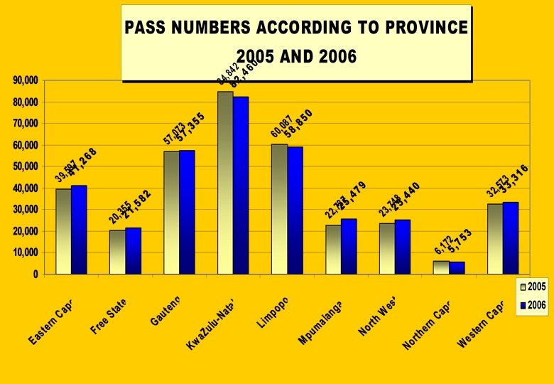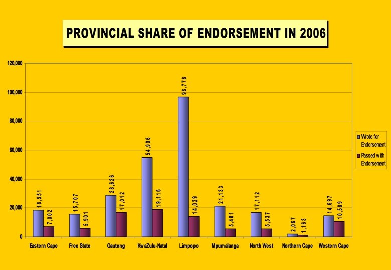 Changes in the numbers passing the Senior Certificate 2005 to 2006 Province 2005 passes 2006 passes Chang e 2006 endorseme nt 7002 Change 1 671 2005 endorseme nt 6176 Eastern Cape Free State 39 597 41 268 20 355 21 582 1 227 5729 5902 173 Gauteng 57 073 57 355 282 16114 17012 898 KZN 84 842 82 460 -2 382 21005 19145 -1 860 Limpopo 60 087 58 850 -1 237 16434 14028 -2 406 Mpumalanga 22 737 25 568 2 831 4918 5504 586 Northern Cape 6 172 5 753 -419 1198 1163 -35 North West 23 748 25 440 1 692 4568 5534 966 W. Cape 32 573 33 316 743 10394 10589 195 Total 347 184 351 503 4 319 88541 87885 656 826