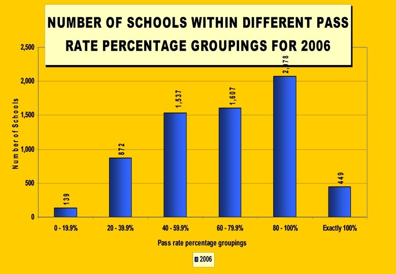 Number of schools with increases in passes per interval 2005 and 2006 Number of Province Schools 1 -5 6 - 10 10+ Total EASTERN CAPE 60 18 9 5 32 FREE STATE 30 16 1 1 18 GAUTENG 70 16 4 0 20 KZN 70 20 9 2 31 LIMPOPO 50 12 4 2 18 MPUMALANGA 30 9 2 0 11 NORTH WEST 40 21 4 2 27 NORTHCAPE 10 5 0 0 5 WESTERN CAPE 40 13 3 2 18 TOTAL 400 130 36 14 180