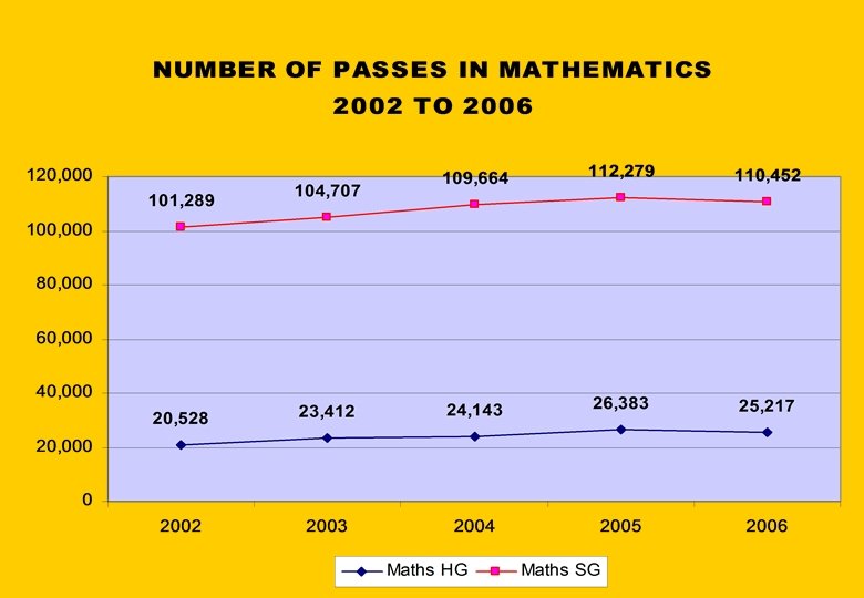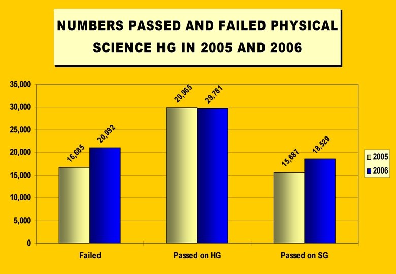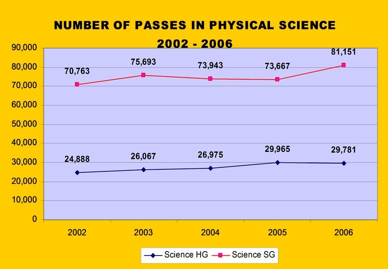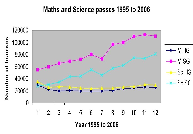Number passing Senior Certificate: Maths and Science in 2000 - 2006 Year Total candidates passing Maths HG Maths SG Phy Sc HG Phy Sc SG 2000 283 294 19 327 79 631 23 344 54 884 2001 277 206 19 504 72 301 24 280 45 314 2002 305 774 20 528 96 302 24 888 56 741 2003 322 492 23 412 99 426 26 067 61 756 2004 330 717 24 143 109 664 26 975 73 943 2005 347 184 26 383 112 279 29 965 73 667 2006 351 503 25 217 110 452 29 781 81 151