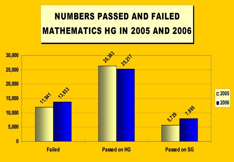 Performance in Mathematics HG in the Senior Certificate in 2004, 2005 and 2006 Provinces HG Passes 2004 HG Passes 2005 HG Passes 2006 – 2005 2006 – 2004 Target HG passes 2009 Eastern Cape 1 535 1 765 1 957 +192 +422 3 000 Free State 1 355 1 440 1 499 +59 +144 3 000 Gauteng 6 604 7 377 6 894 -483 +290 14 000 Kwa. Zulu Natal 5 356 5 365 4 726 -639 -630 11 000 Limpopo 2 046 2 802 2 653 -149 +607 4 000 Mpumalanga 1 283 1 456 1 392 -64 +109 3 000 382 413 416 +3 +34 1 000 North West 1 314 1 444 1 543 +99 +229 3 000 Western Cape 4 268 4 321 4 137 -184 -131 8 000 24 143 26 383 25 217 -1 166 +1074 50 000 Northern Cape Total