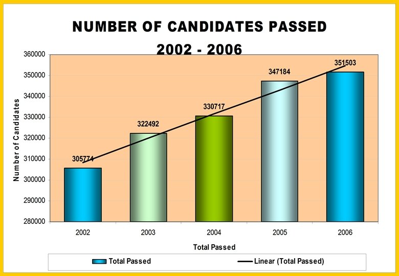 Year 1991 Total candidates 210 passing 314 M HG 20 677 M SG 39 921 Sc HG 23 109 Sc SG 22 216 1992 243 611 21 558 48 568 24 172 23 590 1993 226 943 20 365 44 241 23 835 23 985 1994 287 343 ----- 1995 283 742 29 475 54 947 34 895 28 020 1996 279 487 22 416 59 614 25 462 30 306 1997 264 795 19 575 65 580 26 658 34 584 1998 272 488 20 130 68 315 26 473 43 197 1999 249 831 19 854 72 179 24 191 44 015 2000 283 294 19 327 79 631 23 344 54 884 2001 277 206 19 504 72 301 24 280 45 314 2002 305 774 20 528 96 302 24 888 56 741 2003 322 492 23 412 99 426 26 067 61 756 2004 330 717 24 143 109 664 26 975 73 943 2005 347 184 26 383 112 279 29 965 73 667 2006 351 503 25 217 110 452 29 781 81 151