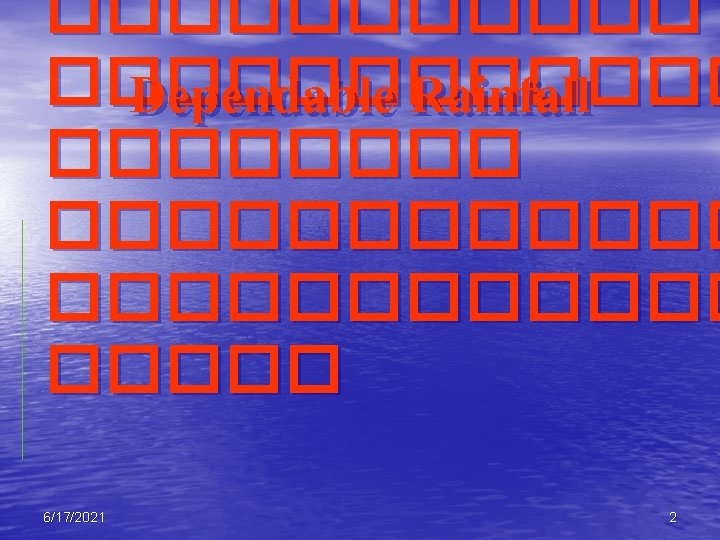 DEPENDABLE RAINFALL : DRY , NORMAL AND WET YEARS 1 Upon the determination of rainfall frequencies and / or probabilities , the question arises how to use this information. Questions which may be posed are following : 6/17/2021 4