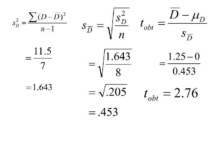 Step 4. Make a decision. l Determine whether the value of the test statistic is in the critical region. Draw a picture. tcrit = -2. 365 tcrit = +2. 365 tobt = 2. 76 l Decision? +tobt > +tcrit Reject Ho