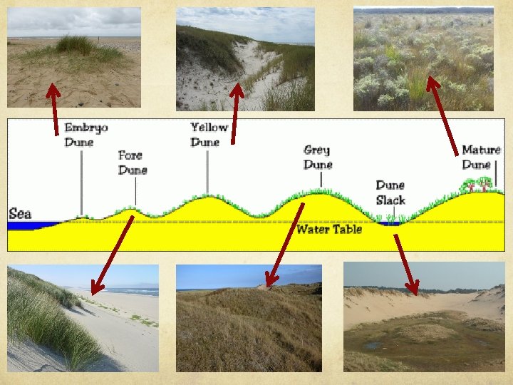 Sand dunes Dunes form where the beach is wide enough to allow for the accumulation of wind-blown sand, and where prevailing onshore winds tend to blow sand inland. Obstacles—for example, vegetation, pebbles and so on— tend to slow down the wind and lead to the deposition of sand grains.