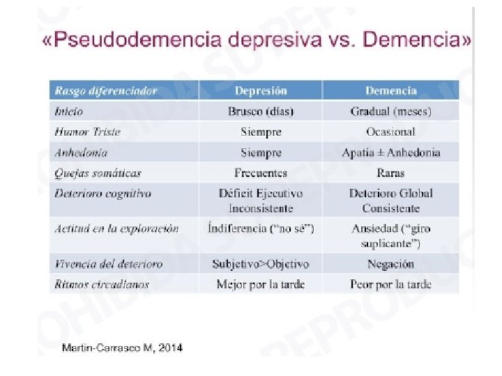 Depresión en el anciano Déficits neuropsicológicos • Disminuye la velocidad de procesamiento de la información • Disfunción ejecutiva • (dificultad para la planificación; baja capacidad para finalizar tareas; memoria de trabajo disminuída, …) • reflejo de alteraciones en las vías fronto-estriado • Lenguaje • Capacidad visuoespacial • Memoria episódica