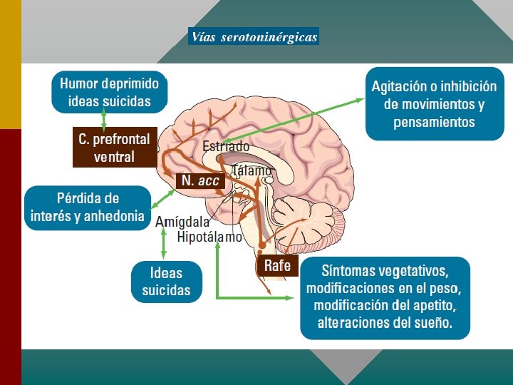 Depresión en el anciano Hay evidencias que se agrupan en torno a la implicación de los mecanismos serotoninérgicos en la génesis de la depresión, con hallazgos sobre mecanismos genéticos y moleculares, precursores y metabolitos, pruebas de función neuroendocrinas y estudios post-mortem sobre cerebro de suicidas depresivos. También los argumentos terapéuticos (con el uso de fármacos que activan la serotonina) dan soporte parcial a esta hipótesis.