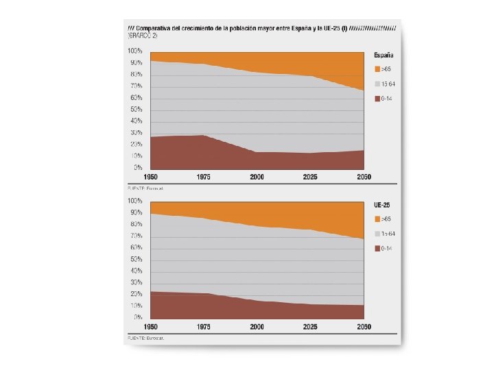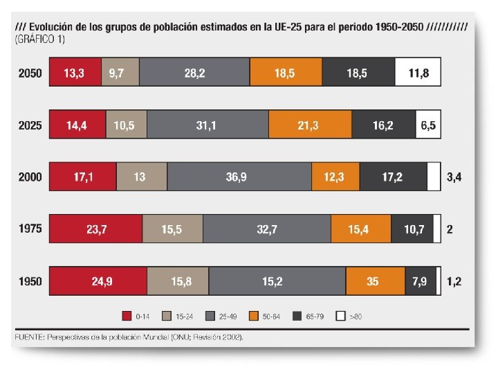 “En España, en menos de 30 años se ha duplicado el número de personas mayores de 65 años” Los datos actuales en España muestran que la población mayor de 65 años se sitúa alrededor del 17% de la población total, con más de 7 millones de personas, de las que aproximadamente un 25% son octogenarias. En este sentido y según las proyecciones realizadas por el INE, en el año 2050 las personas mayores de 65 años estarán por encima del 30% de la población (con casi 13 millones) y los octogenarios llegarán a ser más de 4 millones, lo que supondría más del 30% del total de la población mayor. (Instituto Nacional de Estadística-INE, 2008)