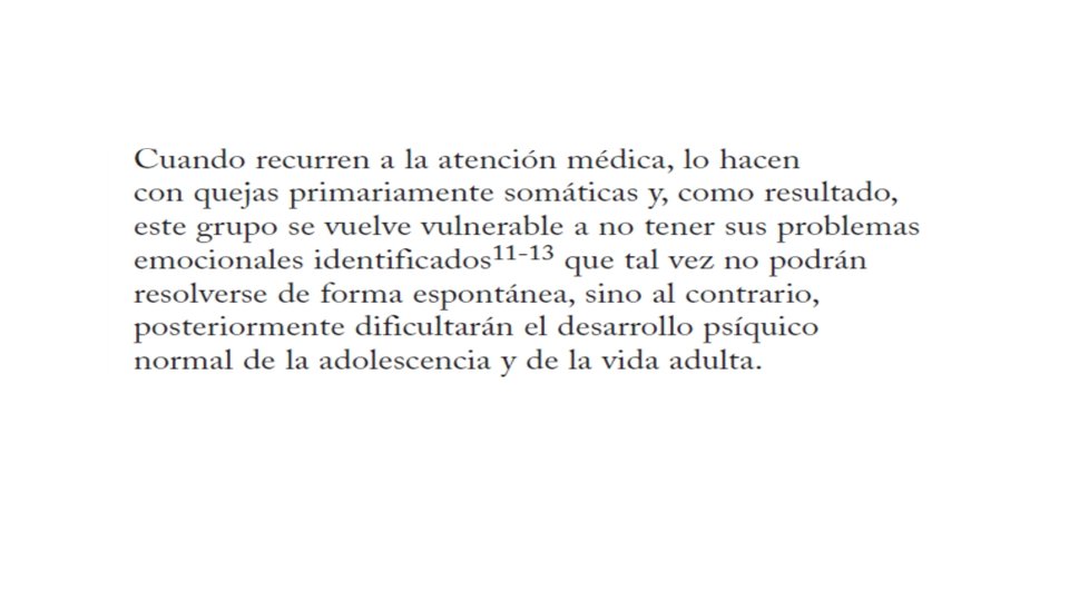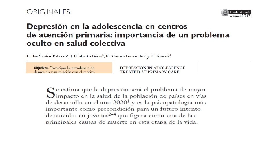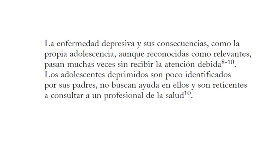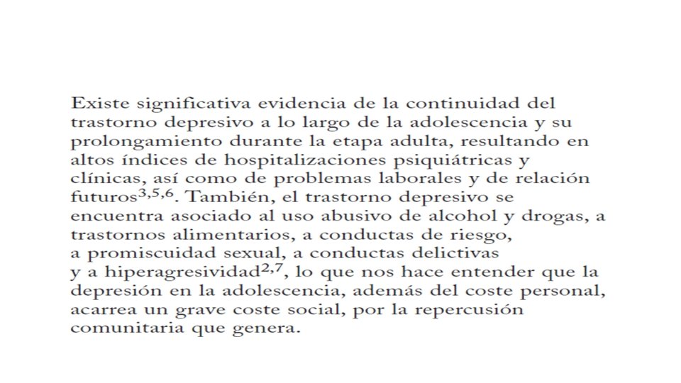 • El 45% de los adolescentes con antecedentes de depresión mayor presentaron otro episodio al comienzo de la edad adulta. • Los trastornos depresivos se asocian con dificultades y complicaciones a largo y a corto plazoen las relaciones con los compañeros, así como un bajo rendimiento escolar y una escasa autoestima persistente. • El riesgo de suicidio, que representa el 12 % de la mortalidad en la adolescencia, es significativo entre los adolescentes con trastornos depresivos.