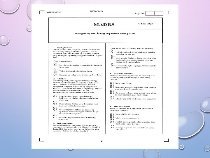 MADRS • KLINISK SEMISTRUKTURERT INTERVJU GJORT AV FAGPERSONELL • MÅLER DYBDEN AV EN DEPRESJON OG SOM HJELPEMIDDEL FOR Å FØLGE OPP EN BEHANDLING • DE SISTE 3 DAGENE • SKÅR: 0 -12 IKKE DEPRESJON ( FULLSTENDIG REMISJON OFTE < 7) 13 -19 LETT DEPRIMERT 20 -34 MODERAT DEPRIMERT 35 -60 ALVORLIG DEPRIMERT