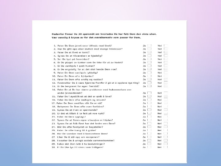 INTERVJUBASERTE GRADERINGSSKALA FOR DEPRESJON • MADRS (MONTGOMERY AND ÅSBERG DEPRESSION SCALE) • GDS (GERIATRISK DEPRESJONSSKALA) • HAD (HOSPITAL ANXIETY DEPRESSION SCALE) • CORNELL SKALA FOR DEPRESJON • NPI (NEVROPSYKIATRISK INTERVJUSKJEMA)