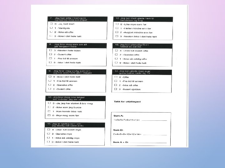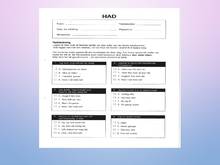 HAD • SELVUTFYLLING PÅ 7 ANGST- OG DEPRESJONSPØRSMÅL • SUM A ELLER SUM D: EN SKÅR PÅ 11 ELLER MER REGNES FOR Å VÆRE ET TILFELLE AV ANGST ELLER DEPRESJON SOM VIL TRENGE NÆRMERE UTREDNING OG EVENTUELT BEHANDLING, EN SKÅR PÅ 8 -10 ANSES SOM ET MULIG TILFELLE • SUM A + SUM D: 19 ELLER MER ANBEFALER NÆRMERE UTREDNING OG EVENTUELT BEHANDLING • MULIG Å FÅ SKÅRE SELV OM PASIENTEN IKKE HAR SVART PÅ 2 SPØRSMÅL ( SUMSKÅREN DELES MED ANTALL BESVARTE SPØRSMÅL OG SVARET GANGES MED 14)