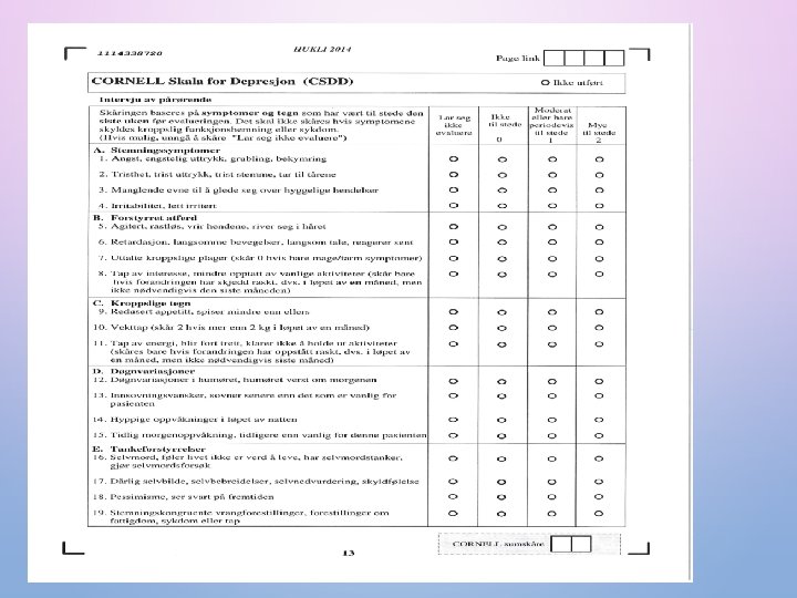 CORNELL SKALA FOR DEPRESJON • UTVIKLET FOR Å KARTLEGGE TEGN OG SYMPTOMER PÅ ALVORLIG DEPRESJON HOS PERSONER MED DEMENS • SKÅR MELLOM 7 -11 INDIKERER MULIG GRAD AV DEPRESJON • SKÅR PÅ 12 ELLER MER INDIKERER MODERAT TIL ALVORLIG GRAD AV DEPRESJON • SKÅR UNDER 6: FORBUNDET MED FRAVÆR AV SIGNIFIKANTE DEPRESSIVE SYMPTOMER • INTERVJU MED PÅRØRENDE, INTERVJU MED PASIENTEN OG OBSERVASJON. ENDELIG SKÅR EN INTERVJUERENS KLINISKE INNTRYKK