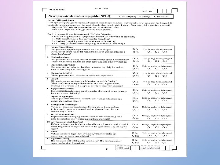 NPI ( NEVROPSYKIATRISK INTERVJUSKJEMA) • INNHENTER INFORMASJON OM PSYKOPATOLOGI HOS PASIENTER MED HJERNELIDELSER (NPI BLE UTVIKLET TIL BRUK HOS PASIENTER MED AD OG ANDRE TYPER AV DEMENS) • KAN BRUKES TIL VURDERING AV ATFERDSENDRINGER VED ANDRE TILSTANDER • SPØRSMÅLENE GJELDER ENDRINGER I ATFERDEN ETTER AT SYKDOMMEN HAR BRØT UT ELLER ETTER DET SISTE BESØK (IKKE MER ENN 4 UKER) • SKÅRING BASERT PÅ HYPPIGHET, ALVORLIGHETSGRAD, PSYKISK BELASTNING.