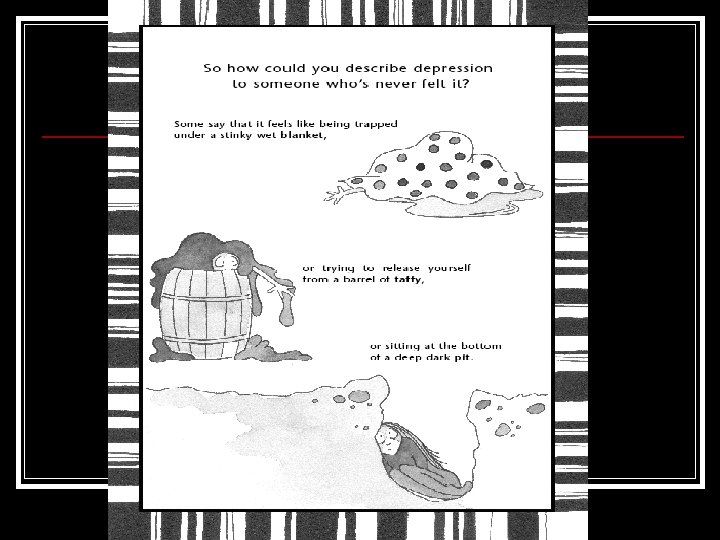 What is the difference between sadness and depression? n Sadness n situational: depends on circumstances – can come and go n Depression n caused by a disruption or imbalance of brain chemistry and persists for long periods of time…. . (can’t just “snap out of it”)