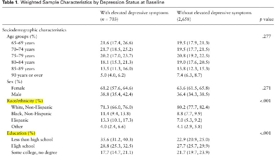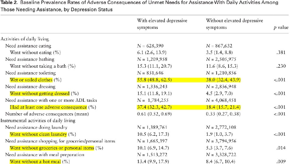 Ø Clinically signifcant depressive symptoms affect 15% of community-living older adults, and the rate is substantially higher among people with physical function limitations Ø Depressive symptoms can be treated successfully with psychotherapy, pharmacological treatment, or a combination. Ø Examining the impact of depressive symptoms may inform practice and policy to reduce the incidence of adverse consequences of unmet needs for assistance with daily activities.