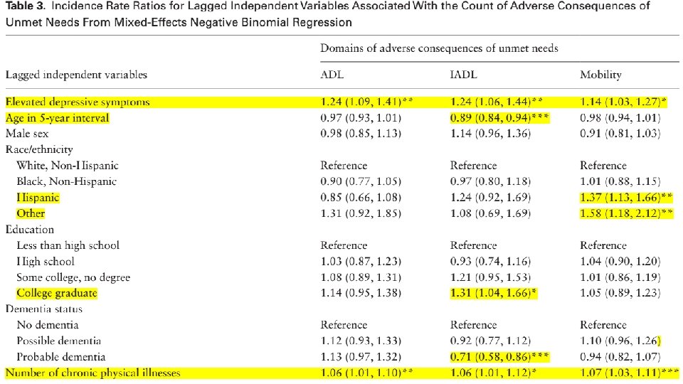 Ø Non-black minorities as compared to non-Hispanic whites reported a higher incidence rate of mobility-related adverse consequences. Ø Unexpectedly, college degree was associated with a higher incidence rate of IADL-related adverse consequences. Ø Consistent with Allen et al. ’s framework (2014), number of chronic physical illnesses and needs were associated with higher rates of adverse consequences of unmet needs whereas community social support was associated with lower rates of adverse consequences.