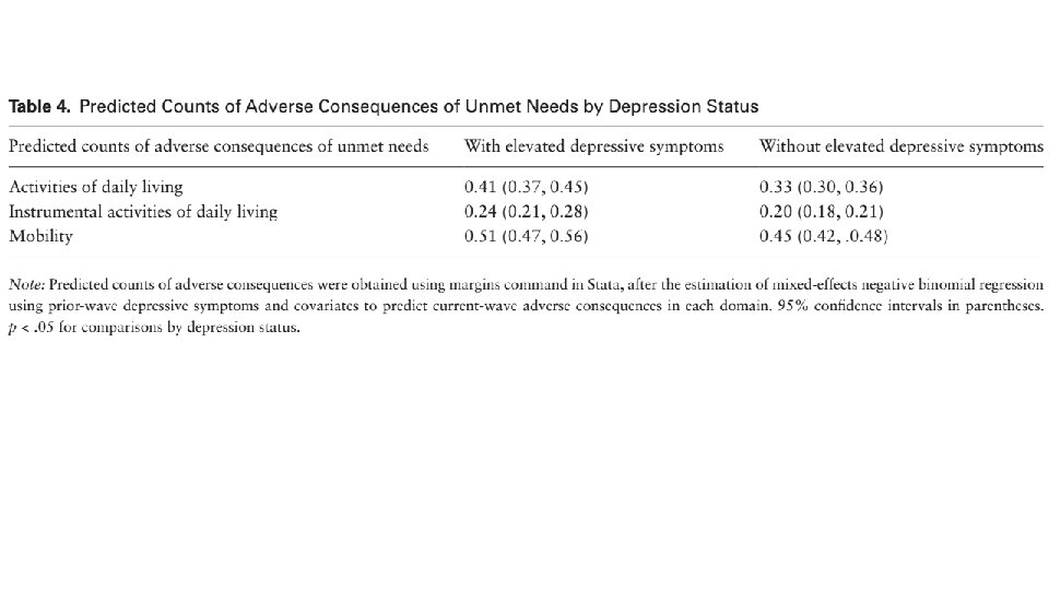 Ø Preventing adverse consequences of unmet needs has important public health implications for improving the quality of life of older adults and reducing health care costs. Ø Previous studies have consistently linked physical function limitations to adverse consequences of unmet needs for assistance with daily activities. Ø However, little is known regarding the psychosocial risk factors. Ø This study begins to fill this knowledge gap by assessing the impact of depressive symptoms on the adverse consequences of unmet needs
