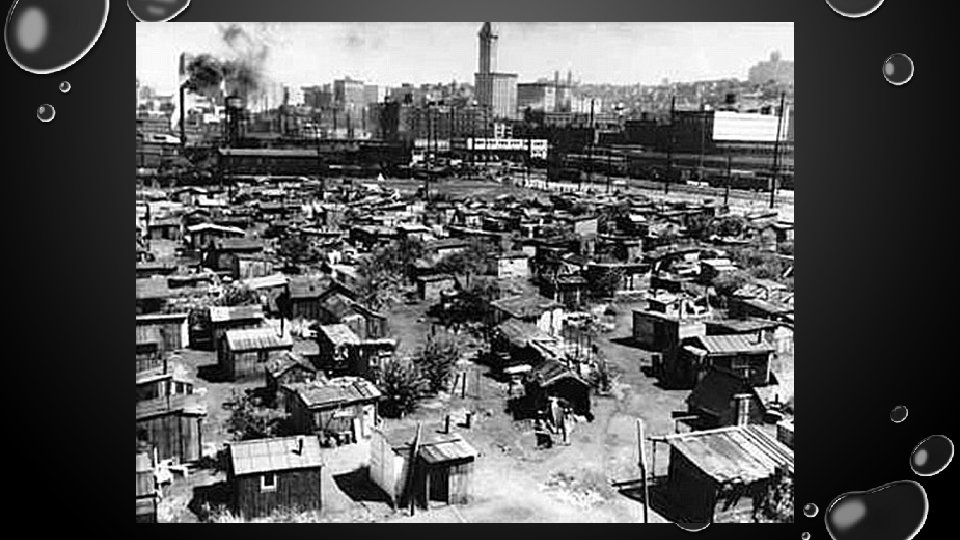 DEPRESSION, THE NEW DEAL & HOPE IN NM • WHEN THE GOVERNMENT FAILED TO PROVIDE RELIEF, PRESIDENT HERBERT HOOVER (1874 -1964) WAS BLAMED FOR THE INTOLERABLE ECONOMIC AND SOCIAL CONDITIONS, AND THE SHANTYTOWNS THAT CROPPED UP ACROSS THE NATION, PRIMARILY ON THE OUTSKIRTS OF MAJOR CITIES, BECAME KNOWN AS HOOVERVILLES.