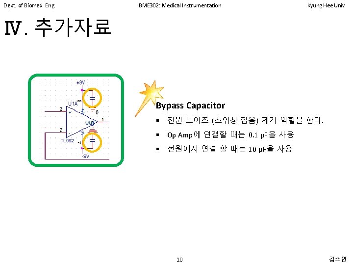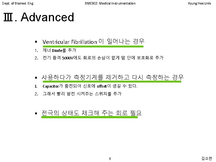 Dept. of Biomed. Eng. BME 302: Medical Instrumentation Kyung Hee Univ. Ⅱ. Circuit Design ⅰ. Amplifier 단계 2 High Pass Filter Input Bias Current 에 의한 DC offset 전압의 불균형을 없애주기 위해 추가 저 항 Non-inverting Amp with Low Pass Filter High Pass Filter =67 반전 증폭은 Loading Effect 생길 것 같으므 로 비 반전 증폭을 이용하였다. 8 김소연