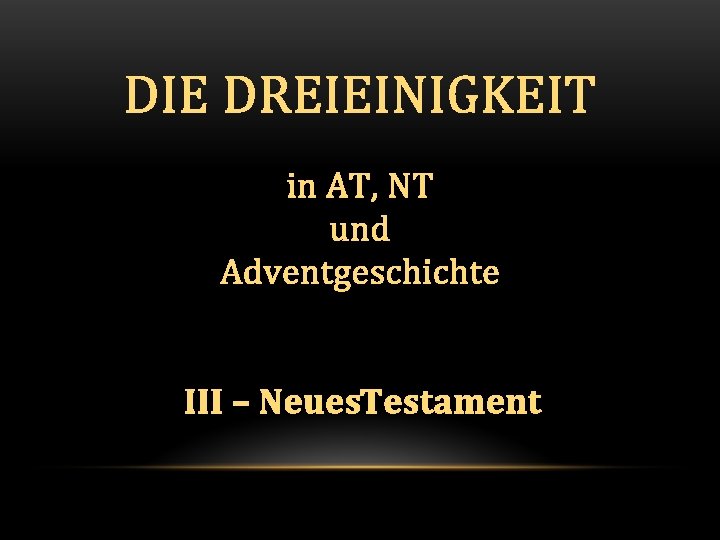 Der dreieinige Gott im NEUEN Testament 5. Mose 29, 28 „Was verborgen ist, ist des HERRN, unseres Gottes; was aber offenbart ist, das gilt uns und unsern Kindern ewiglich. “ „Gott will ebenso wohl anerkannt werden auf Grund dessen, was er nicht von sich offenbart hat als auf Grund dessen, was unserem beschränkten Fassungsvermögen verständlich ist. Sowohl in der göttlichen Offenbarung als auch in der Natur hat Gott Geheimnisse gegeben, die unsererseits Glauben erfordern. Dies muss so sein. Wir mögen immerfort suchen, immer weiter forschen, immer mehr lernen und doch ist noch Unendliches zu erreichen. “ (Ellen White, Auf den Spuren des großen Arztes, 437 = MH 431)