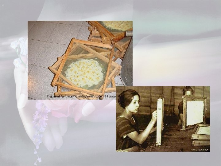 Enfleurage • Älteste Methode um Duftstoffe zu gewinnen • Umständlich und teuer • Heutige Anwendung für Jasmin und Tuberose • Glasplatten werden mit Fett bestrichen, Blüten werden dazwischen gelegt • Das kalte Fett absorbiert die Duftstoffe